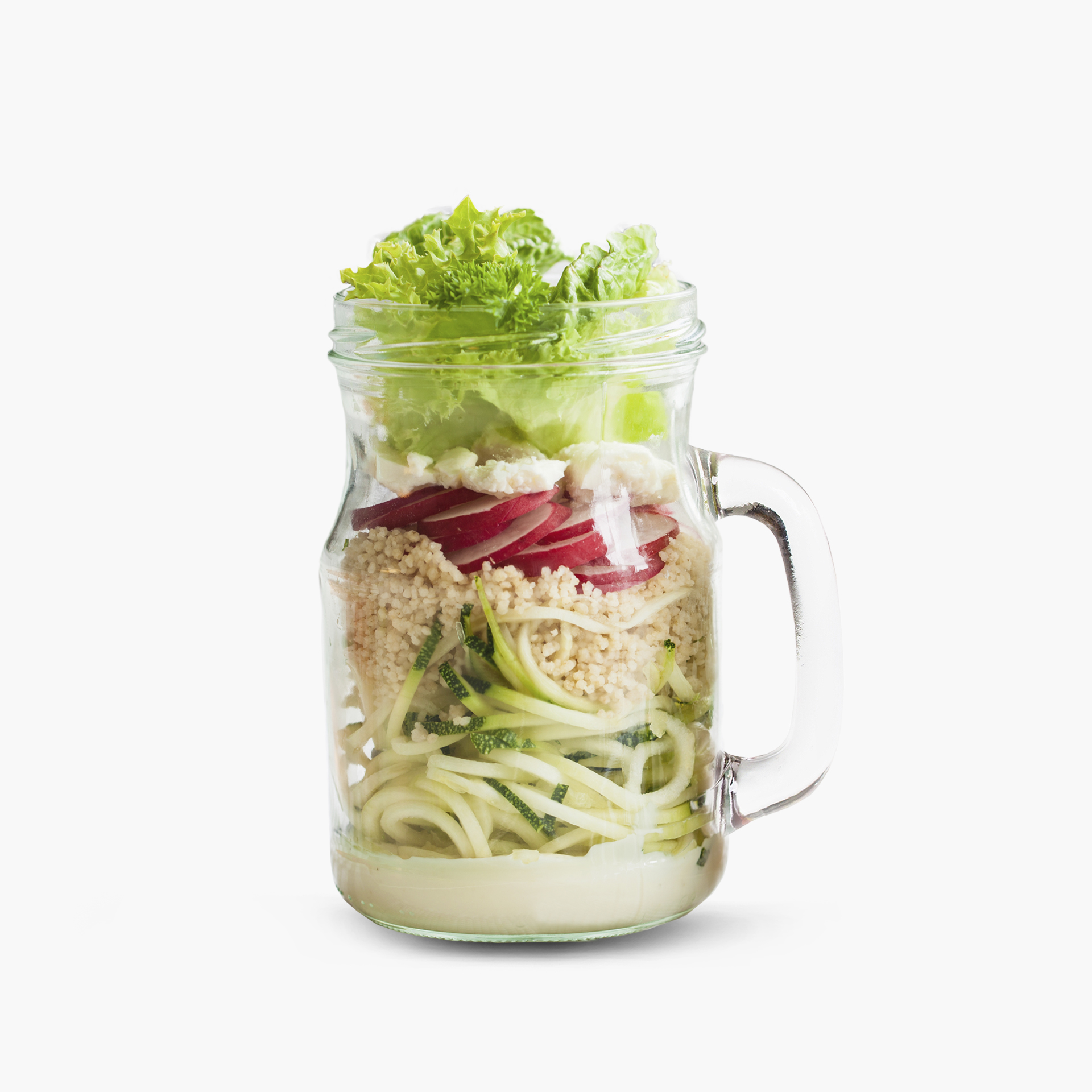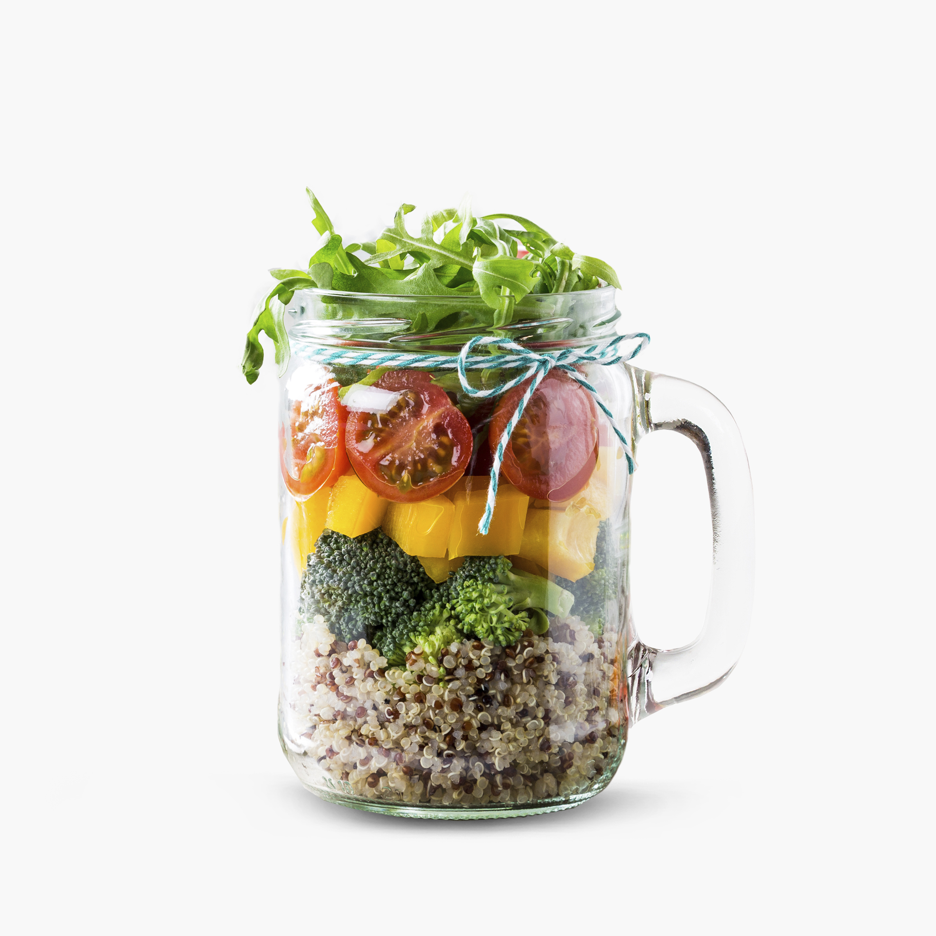 Cada ensalada en frasco es una mezcla equilibrada de ingredientes frescos y vibrantes, cuidadosamente seleccionados para mantener su sabor y textura.